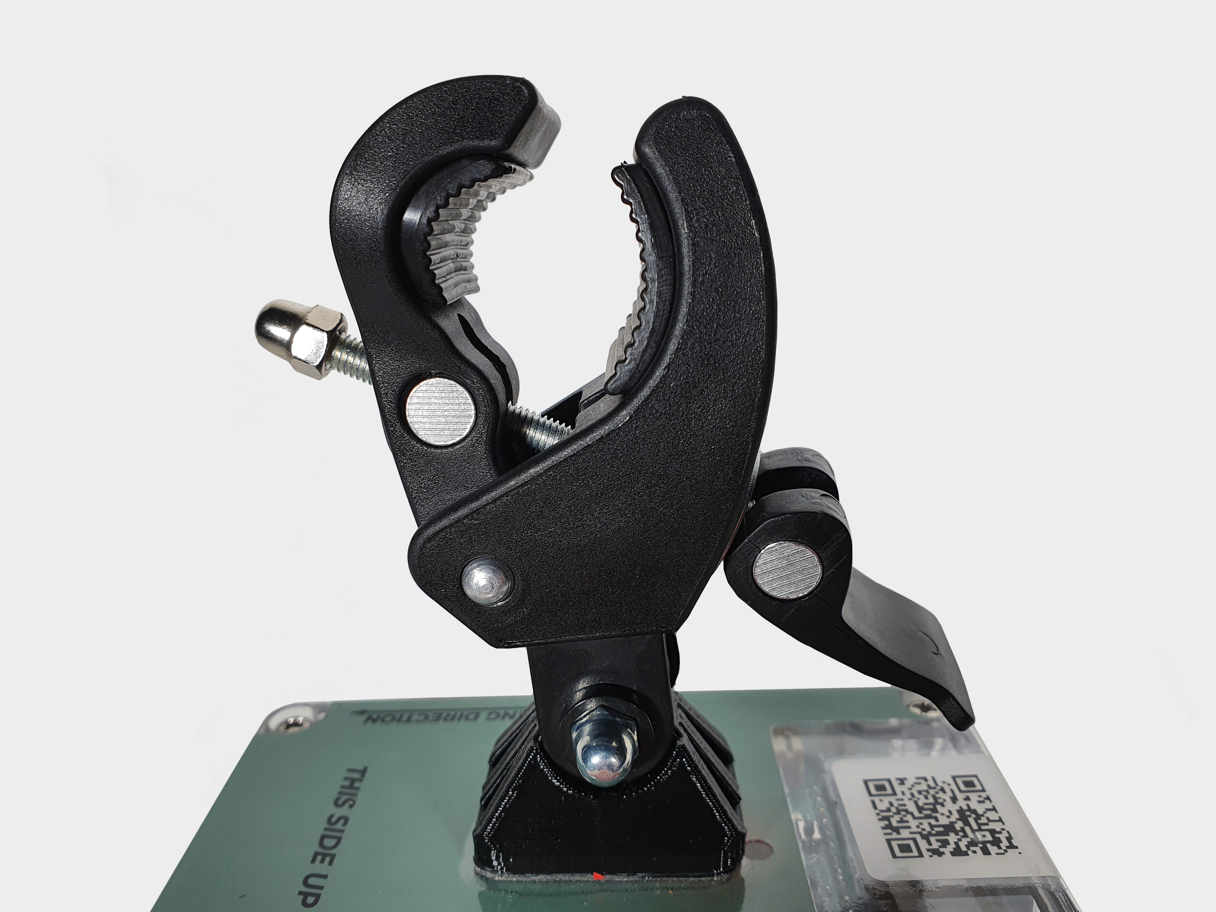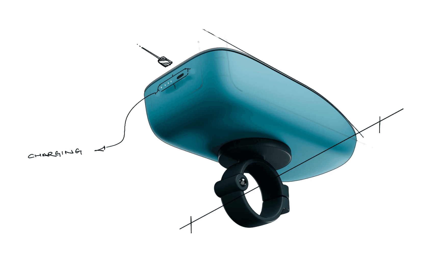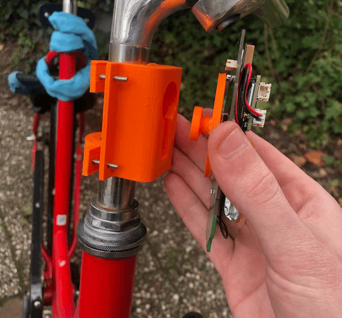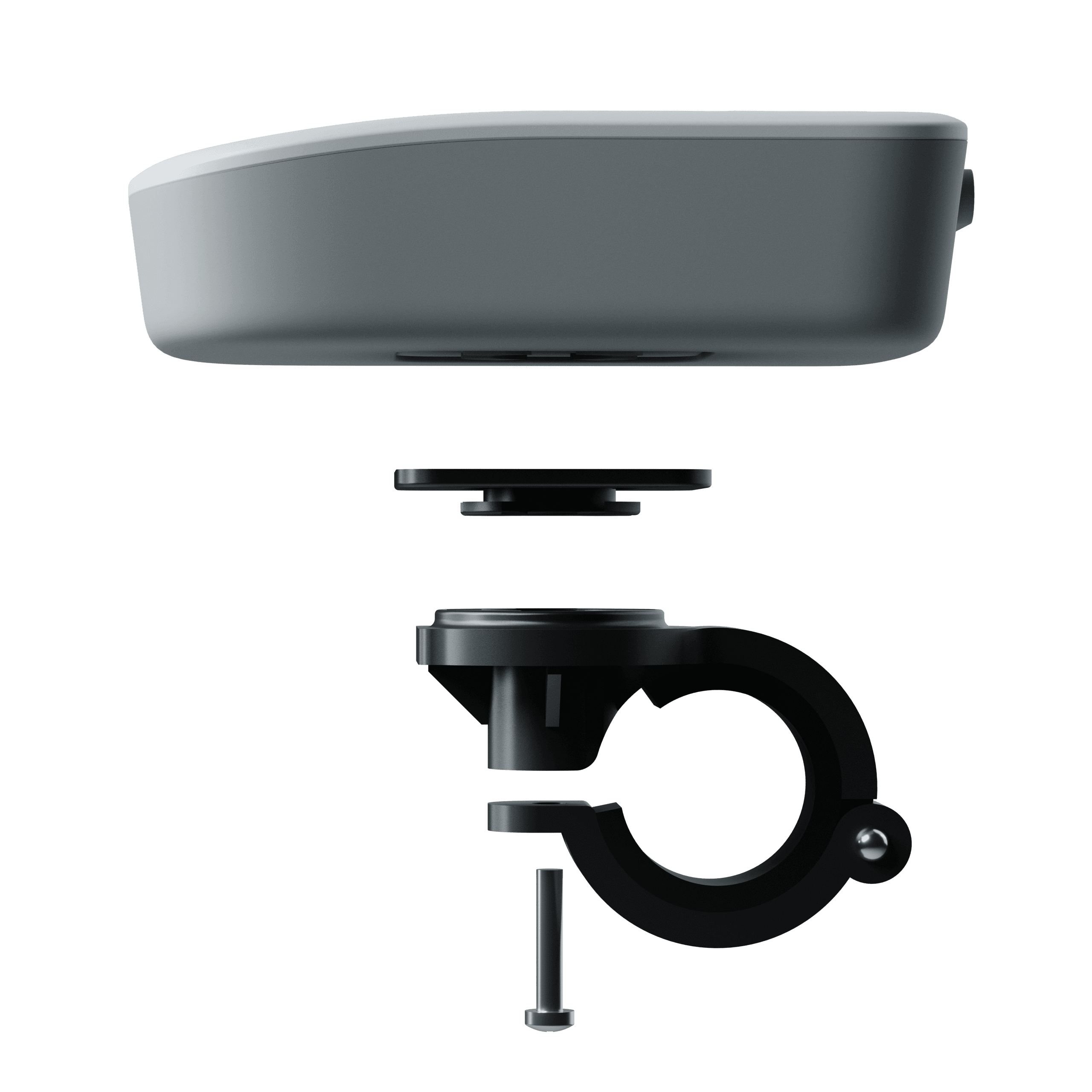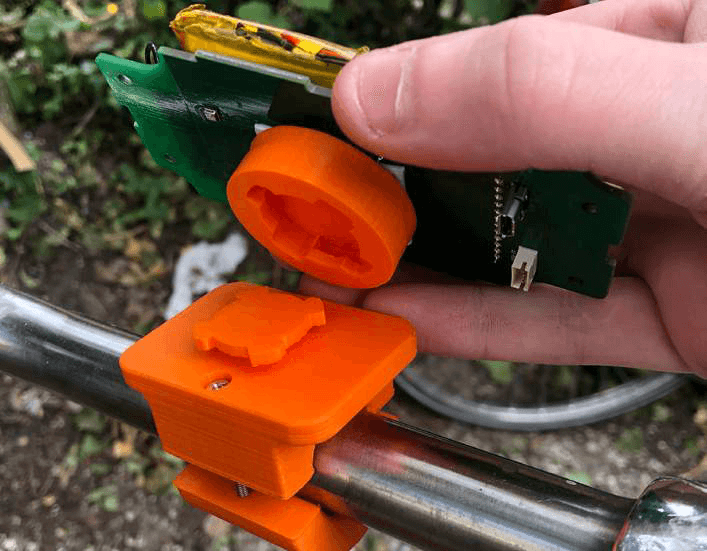 The attachment system is a simple turn-lock mechanism with a Hall Effect sensor where the device turns off when it is removed from the bicycle saving power.